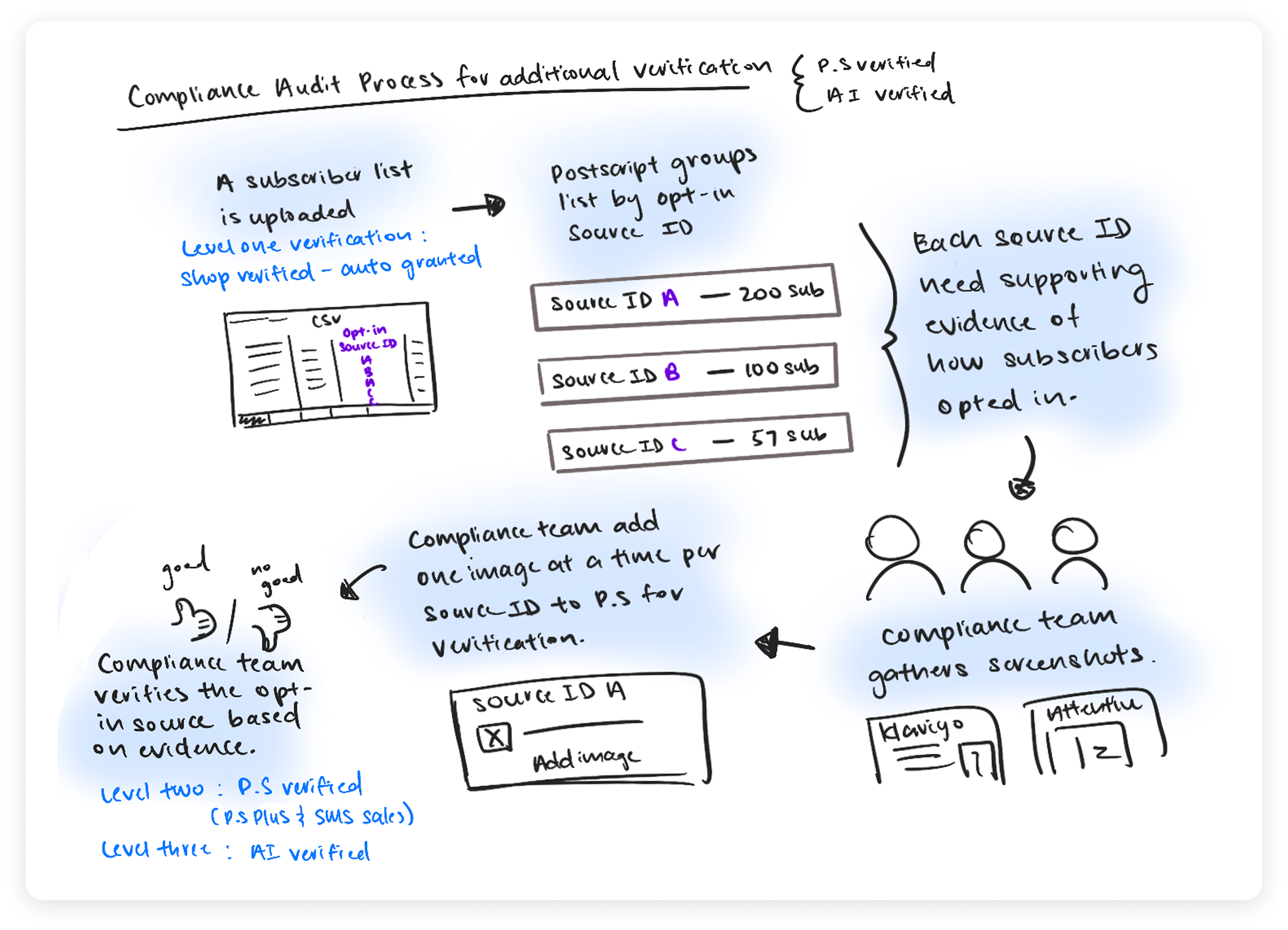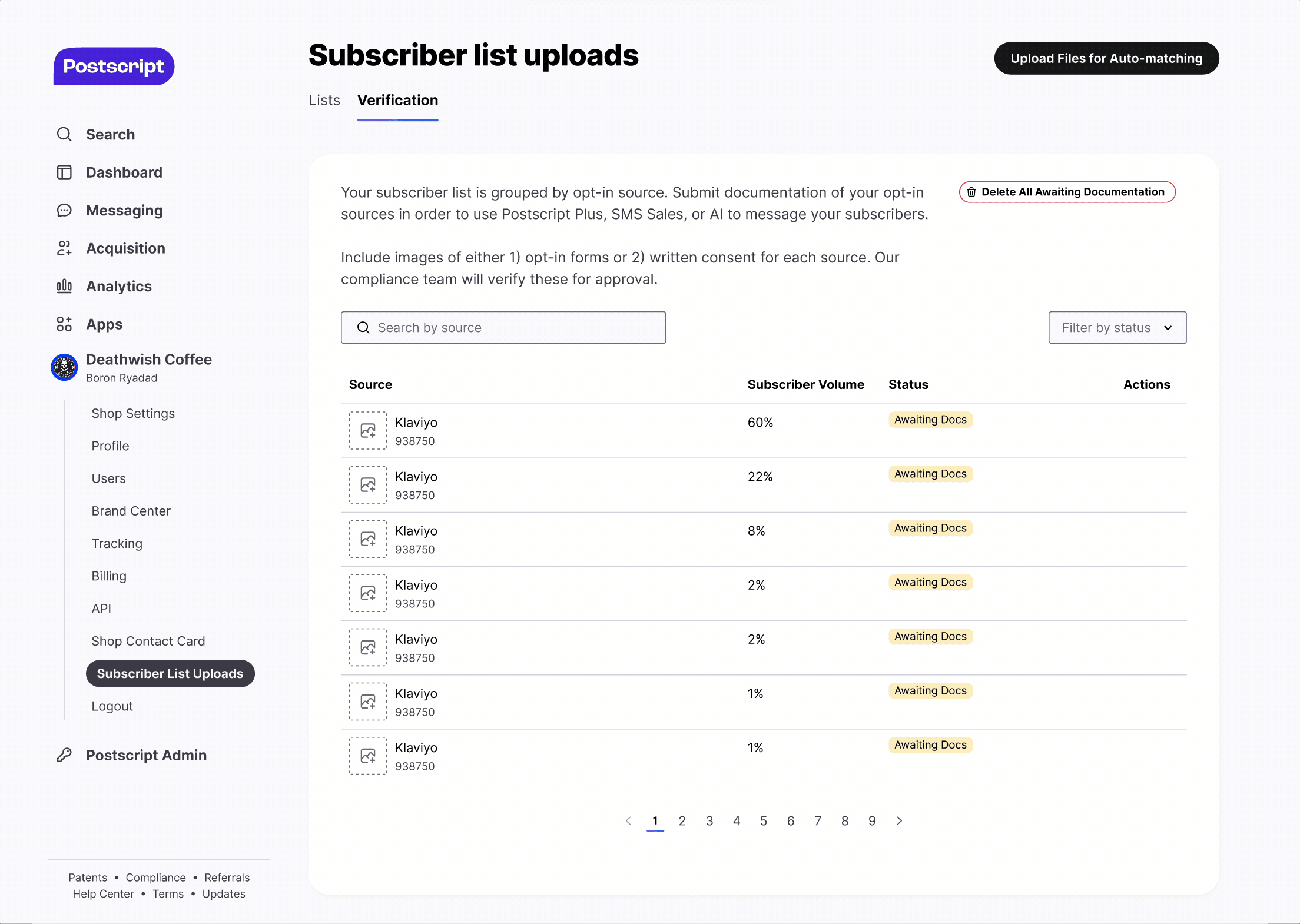 To verify SMS opt-ins for The Campaign Registry, the Compliance team must upload screenshot evidence provided by merchants and match each file to a specific opt-in instance (Source ID). This workflow is required before new merchants go live with Postscript.